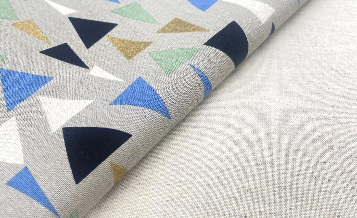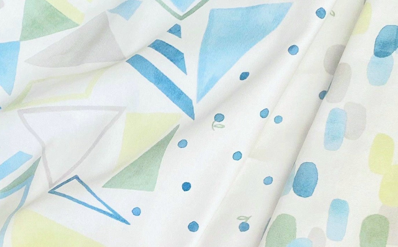 透明感があり、淡い雰囲気の色合いと、maru・dot・sankaku、3つの柄がひとつの生地になったデザインに展示会でひとめぼれしました。爽やかな色合いが可愛い、夏にぴったりのシリーズです。