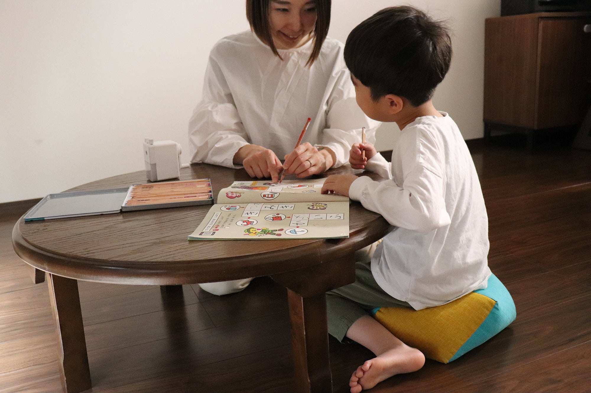 ママの目の届くリビングでの学習タイムにも、“おじゃみkids”はおすすめです。 -