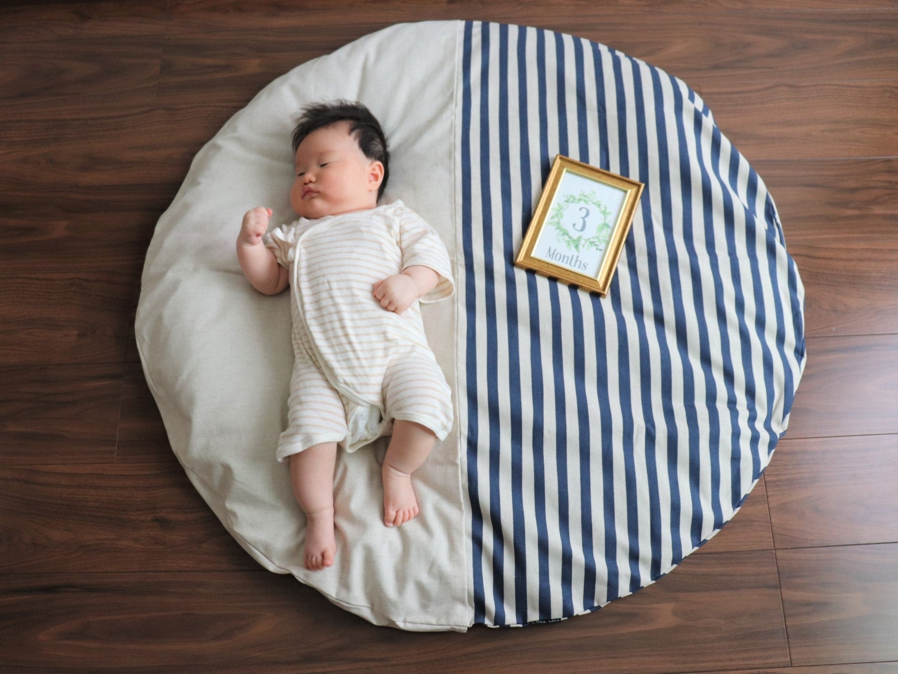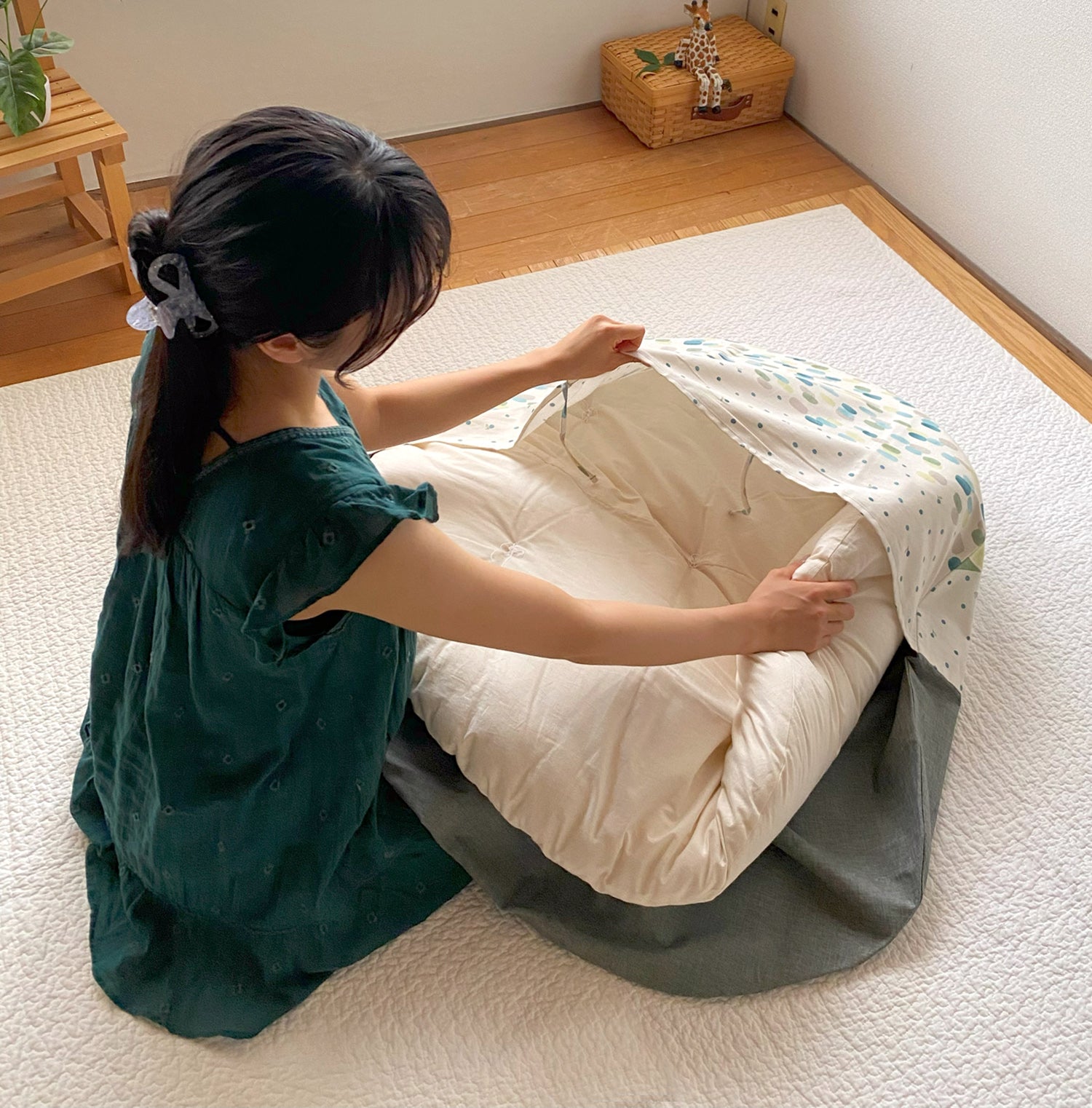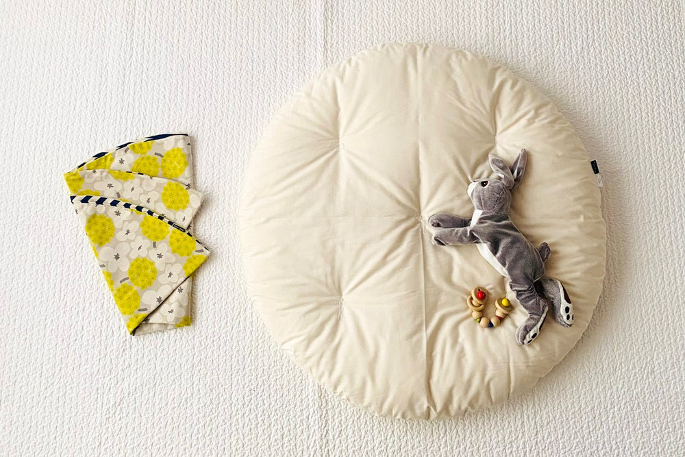 せんべい座布団ひとつで、ベビーと家族の快適空間が生まれます。リビングでちょっと寝かせておきたいときにも便利です。